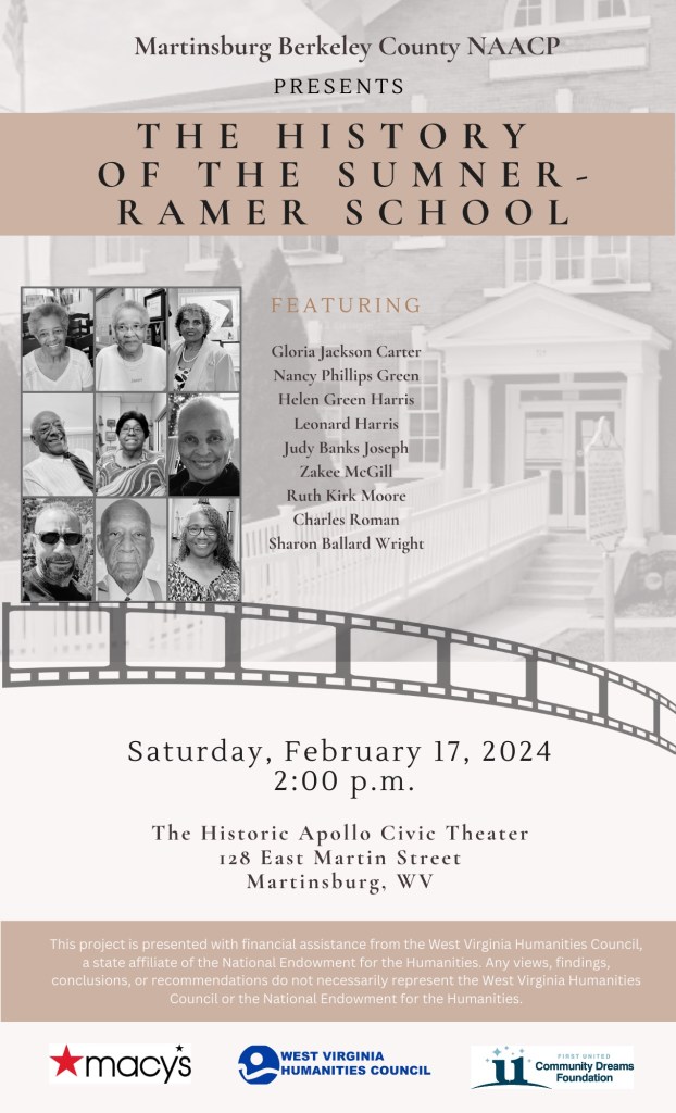 On February 17, 2024, we celebrated Black History Month at The Apollo Civic Theater. We premiered a documentary film about the history of the Sumner-Ramer Memorial School. Nearly 500 in our community gathered to learn about this cherished school. Former students shared their memories. Our education committee obtained funding from the WV Humanities Council, Macy’s and First United Bank. We spent seven months collaborating on the end product with Shaun Galang of Cedarmeade Studios. We are proud to share our work with you.
